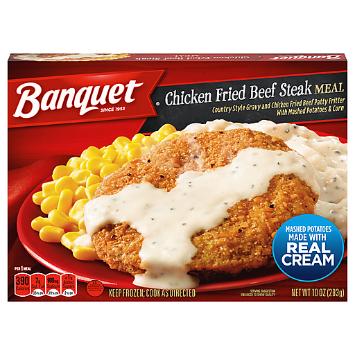 Banquet Chicken Fried Beef Steak frozen meal brings delicious ready made meals to your table in minutes. This frozen dinner features a chicken fried beef patty fritter with country style gravy, mashed potatoes and corn for a delicious meal. Enjoy Banquet frozen meals any night of the week when you're in the mood for a beef patty. Preparation of this frozen food is easy. Simply follow the instructions on the package to prepare frozen lunches and dinners in the oven for fresh-cooked taste or in the microwave for quick, prepared meals. Store the 10 ounce chicken fried beef steak meal in the freezer until you’re ready to enjoy frozen entrees. in the U.S.A. for over 60 years, Banquet has been making delicious food the whole family loves.