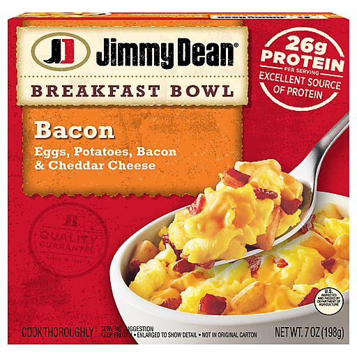 Filled with crispy bacon, eggs, potatoes and cheddar cheese, Jimmy Dean Bacon, Egg & Cheese Breakfast Bowls include 26 grams of protein per serving. Each bacon breakfast bowl is an excellent source of protein for your morning option. Simple to prepare and ready in minutes, this microwavable breakfast is made with the Jimmy Dean brand quality you know and trust. This package includes one 7 oz frozen breakfast bowl.