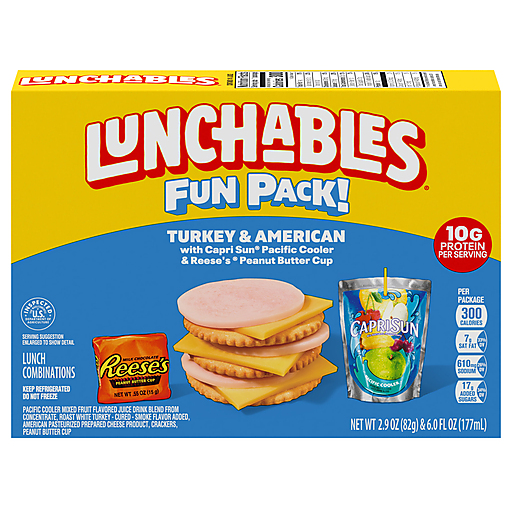 Have fun with lunch! Lunchables Turkey & American with Capri Sun Pacific Cooler and Reese's Peanut Butter Cup Fun Pack! lets kids eat it their way — no prep needed! Each 2.9 ounce tray contains cured roast white turkey - smoke flavor added and American pasteurized prepared cheese product that are perfectly paired with buttery, flaky crackers featuring the perfect combo of salty and sweet flavor. For a tasty treat, enjoy a delicious Reese's Peanut Butter Cup. Sip on a 6 fl oz pouch of Capri Sun Pacific Cooler mixed fruit flavored juice drink blend from concentrate. Packed with protein and fun in every bite, each serving contains 10 grams of protein. Our Lunchables Fun Pack! tastes great and is perfect as part of school lunches, weekend bites or any time hunger strikes. The real win is that kids get to make it and eat it their way! Keep Lunchables refrigerated until you're ready to enjoy.