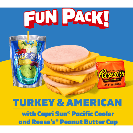 Have fun with lunch! Lunchables Turkey & American with Capri Sun Pacific Cooler and Reese's Peanut Butter Cup Fun Pack! lets kids eat it their way — no prep needed! Each 2.9 ounce tray contains cured roast white turkey - smoke flavor added and American pasteurized prepared cheese product that are perfectly paired with buttery, flaky crackers featuring the perfect combo of salty and sweet flavor. For a tasty treat, enjoy a delicious Reese's Peanut Butter Cup. Sip on a 6 fl oz pouch of Capri Sun Pacific Cooler mixed fruit flavored juice drink blend from concentrate. Packed with protein and fun in every bite, each serving contains 10 grams of protein. Our Lunchables Fun Pack! tastes great and is perfect as part of school lunches, weekend bites or any time hunger strikes. The real win is that kids get to make it and eat it their way! Keep Lunchables refrigerated until you're ready to enjoy.