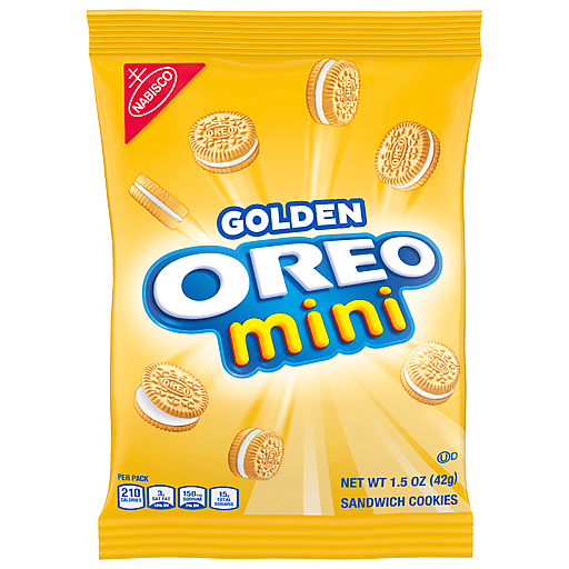 OREO Mini Golden Sandwich Cookies pack the classic flavor you love into perfect bites for easy snacking. These mini vanilla sandwich cookies are filled with classic OREO creme, making them supremely delicious. Golden OREO mini cookies are great for sharing with friends and family, serving at parties, or enjoying with cold milk. Toss one of these snack food packs into your lunch for a tasty treat, or grab a pack at home whenever you're craving sweet snacks. OREO Mini snack cookies also make a great dessert topper that you can add to ice-cream, brownies and cakes. These OREO Mini sandwich cookie cups are the perfect size for stashing away for yourself or keeping ready for snacks on the go.