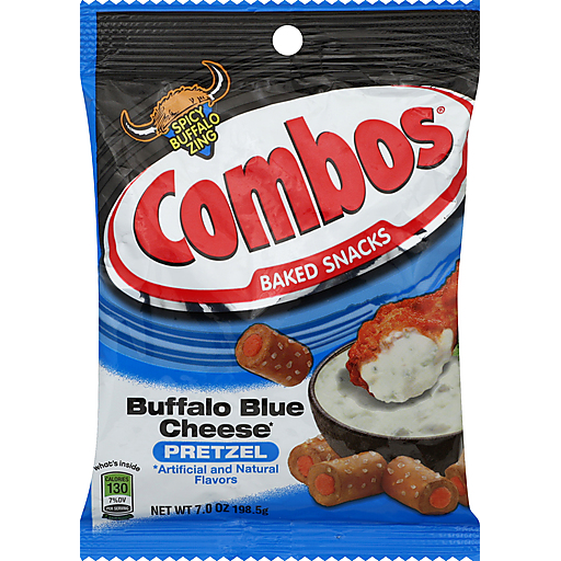 Limited Edition. Baked snacks. Natural and artificial flavored filling. 130 calories (7%) DV per serving. 7 servings per pack. Crunchy oven baked pretzels with spicy buffalo blue cheese flavored fillings create the perfect hunger management snack. Two hearty tastes - one filling snack. Enjoy the delicious taste of Combos Baked Snacks. What's inside. Per serving (7 servings per pack). Calories: 130 (7%) DV; Total fat: 4.5 g (7%) DV; Sat. fat: 3 g (15%) DV; Sugars: 4 g (No DV defined); Sodium: 360 mg (15%) DV.